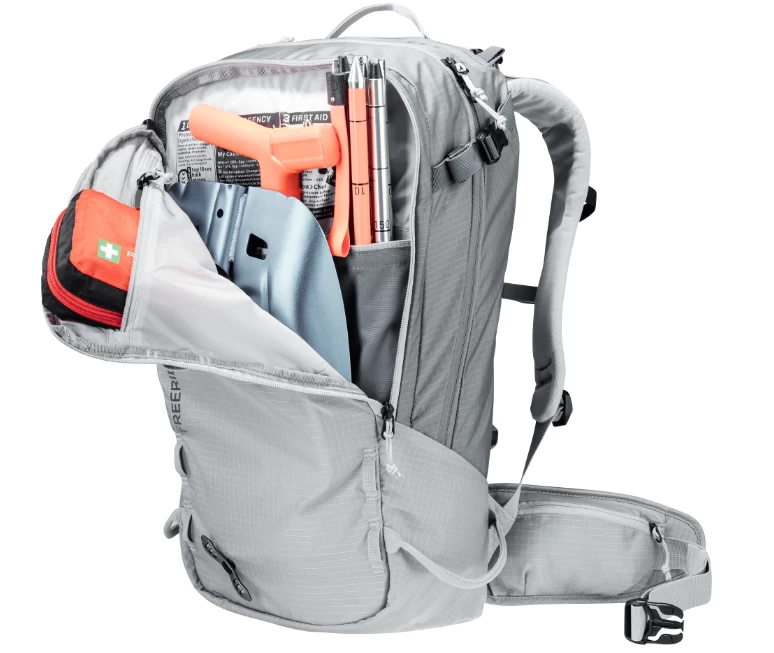 Der Freerider begeistert mit seiner sehr durchdachten Winter-Ausstattung, zum Beispiel mit der komplett aufklappbaren Rückenöffnung. Zum einen bietet er so einen optimalen Überblick über die Ausrüstung. Zum anderen bleibt das Rückensystem beim Ablegen des Rucksacks trocken. Sollte trotzdem etwas Schnee an das Tragesystem gelangen, sorgt das neue robuste, atmungsaktive und schneeabweisende Material für einen trockenen Rücken. Auch das Thema Sicherheit wird beim Freerider großgeschrieben. Mit dem separaten und schnell zugänglichen Sicherheitsfach für Sonde und Schaufel hält der Touren-Rucksack das Wichtigste im Notfall griffbereit. Neu ist auch das variable Fixierungssystem. Mit zwei separaten Riemen können Skier, Snowboard und Schneeschuhe im Handumdrehen außen am Rucksack befestigt werden: Skier diagonal oder in A-Form, Snowboard und Schneeschuhe vertikal. Außerdem dienen die flexibel einsetzbaren Befestigungsriemen zur seitlichen Kompression.
