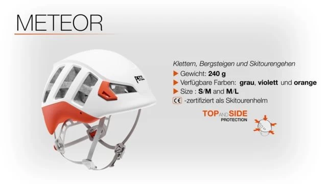 Der zum Klettern, Bergsteigen und Skitourengehen konzipierte leichte, kompakte METEOR-Helm verfügt über eine ausgezeichnete Belüftung und bietet im Sommer wie im Winter guten Tragekomfort. Das den Kopf umschließende Design gewährleistet einen erhöhten Schutz im gesamten Kopfbereich. Der METEOR ist der erste CE-zertifizierte Skitourenhelm. Bis ins Detail durchdacht, lässt er sich optimal mit einer Skibrille oder einem Visier kombinieren und eignet sich ideal zum Skibergsteigen. Der Helm erfüllt nicht die Anforderungen der Helmnorm EN 1077 für alpine Skiläufer.